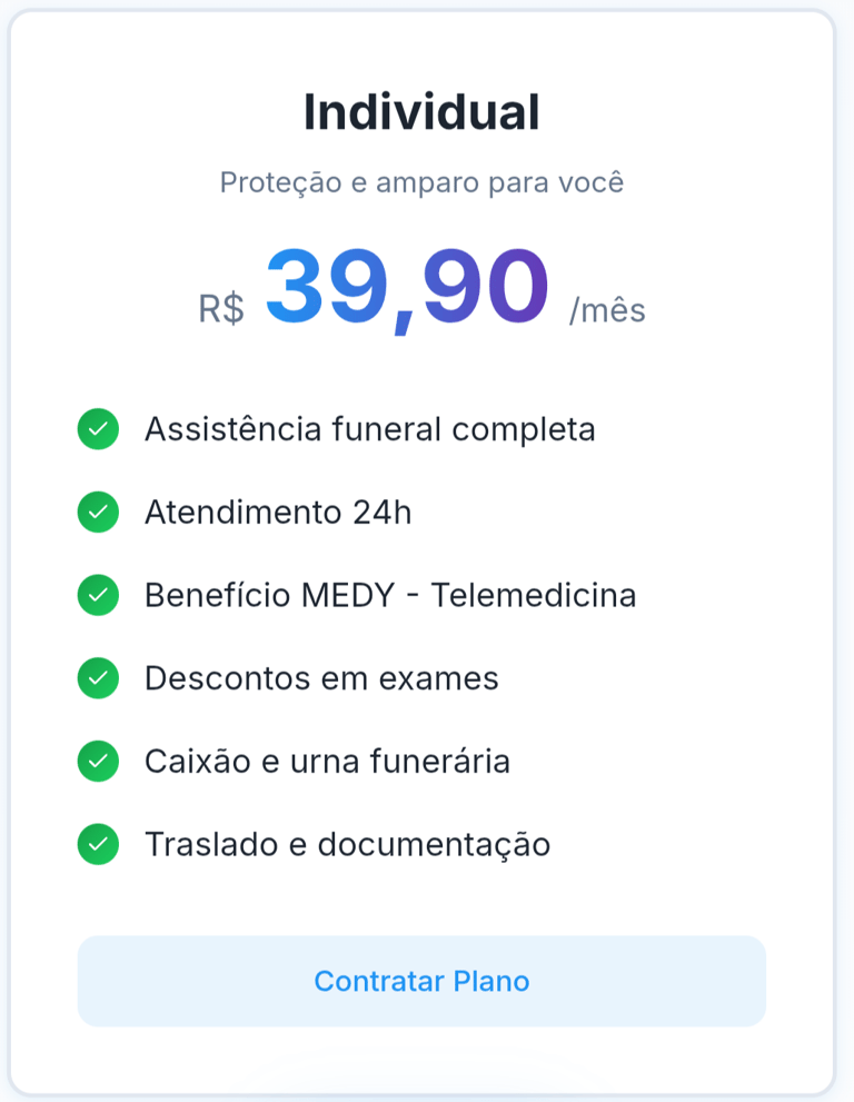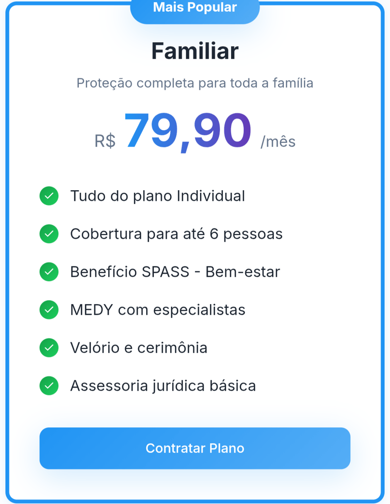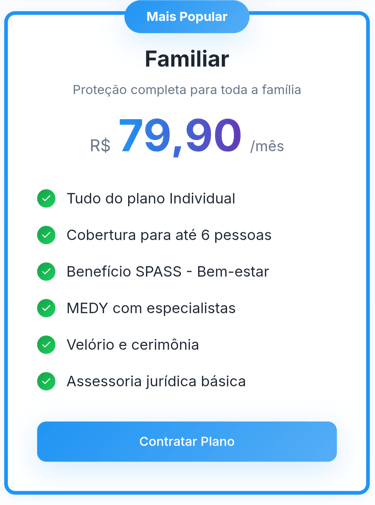 Assistência funeral 24h com todo suporte necessário, além de benefícios em vida como telemedicina (MEDY) e bem-estar (SPASS) para sua família.